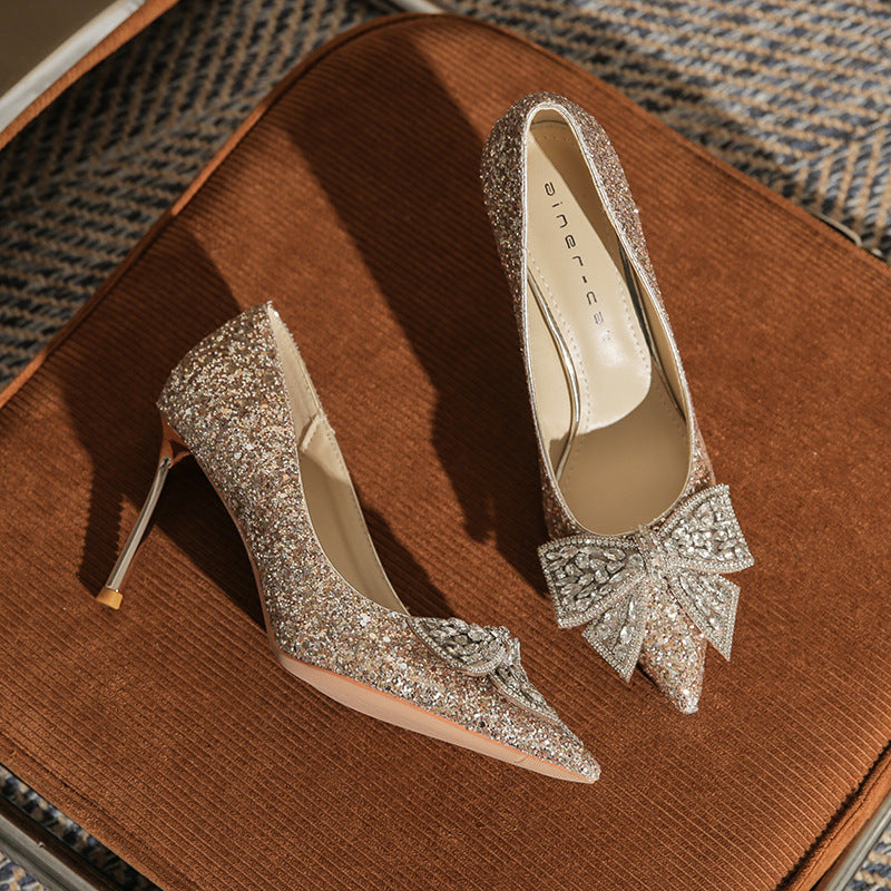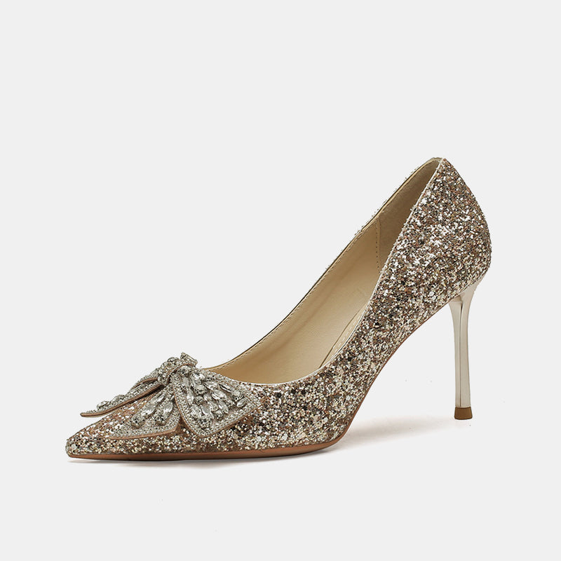 These Jaborosa wedding pumps feature a pointed toe, rhinestone detailing, and a bow for a touch of femininity. The stiletto heel provides height and the solid color scheme adds elegance. Made with high-quality materials including PU, rubber, viscose, and sequins, these pumps are perfect for any wedding celebration.